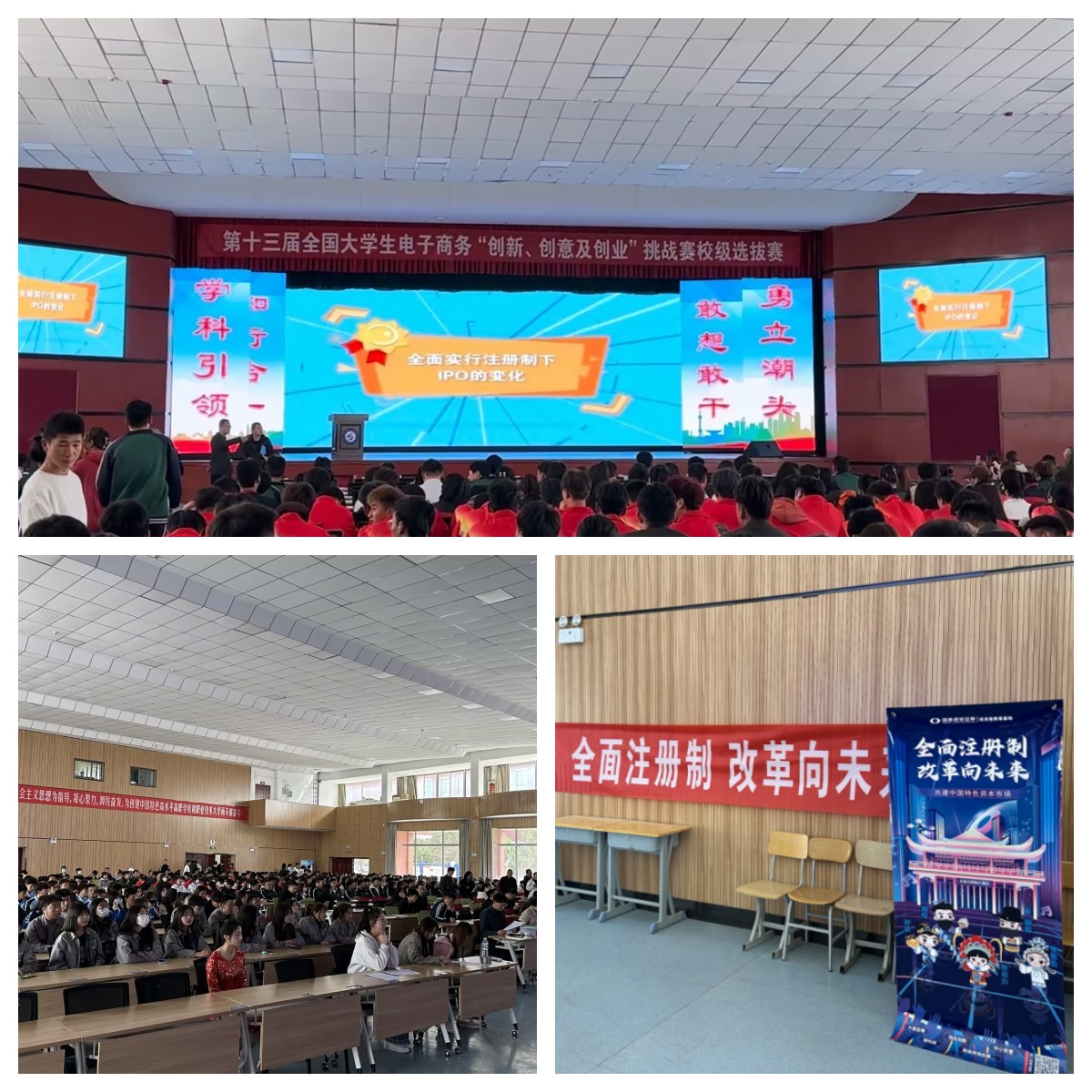 2023年4月13日我们走进酒泉职业技术学院第十三届全国大学生电子商务“创新、创意及创业”挑战选拔赛。参与赛事的大学生有400人以上,他们怀揣创业梦想,结合自己的专业和最新的技术、政策等进行业内创新,有的结合AI和中医,解决中医诊断中的效率提升,有的针对工业技术改进提出了好的想法。在这样一个创业氛围浓重的环境下,我们向学生们详细介绍了全面注册制的政策背景和影响以及在融资渠道方面,针对大学生的资金支持等内容,进一步拓展了创业大学生融资渠道视野。